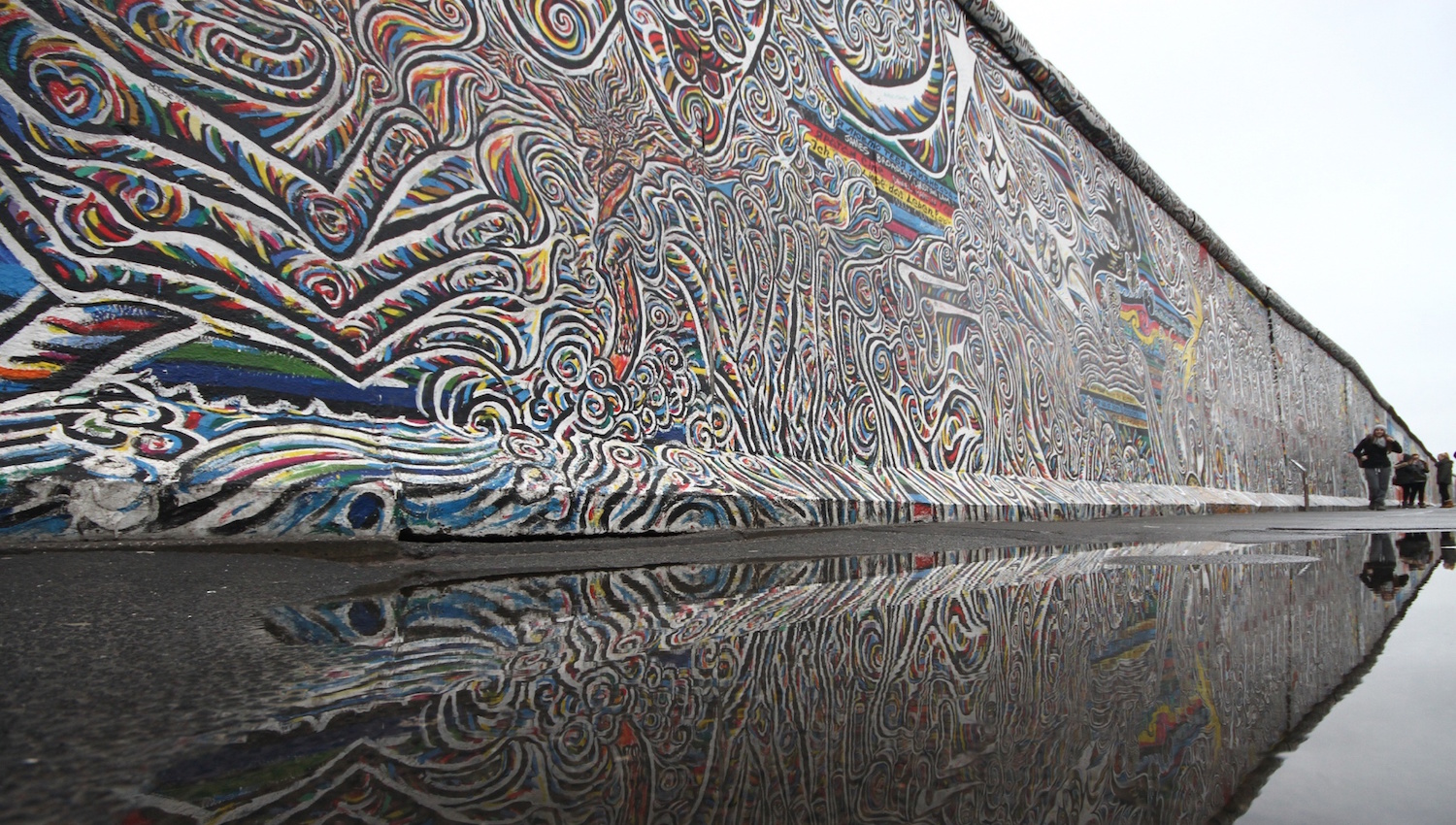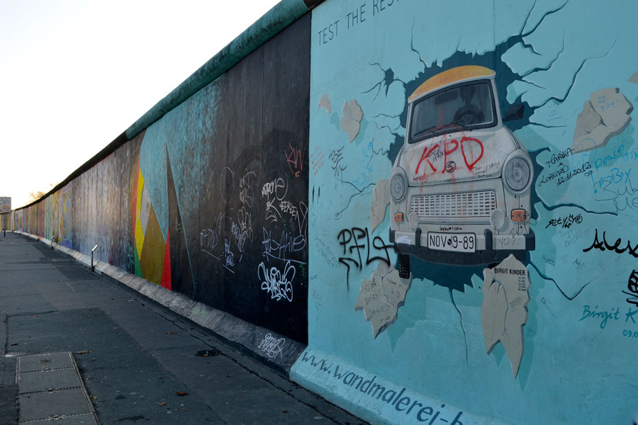 Now is the wall a monument of modern art. Artists from 21 different countries had paint on the east side of this wall. The most paintings have a story.